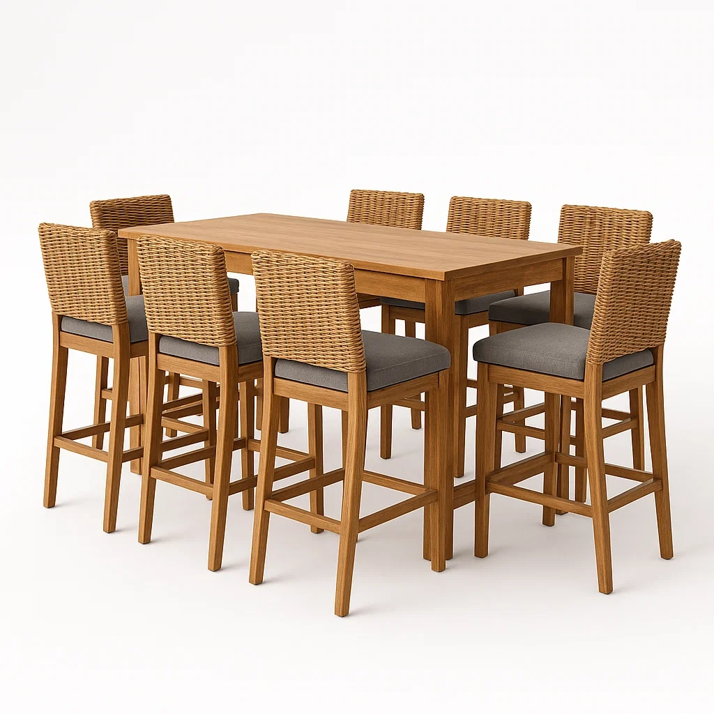 Conjunto de bar alto de madera y ratán con asientos grises 8 piezas