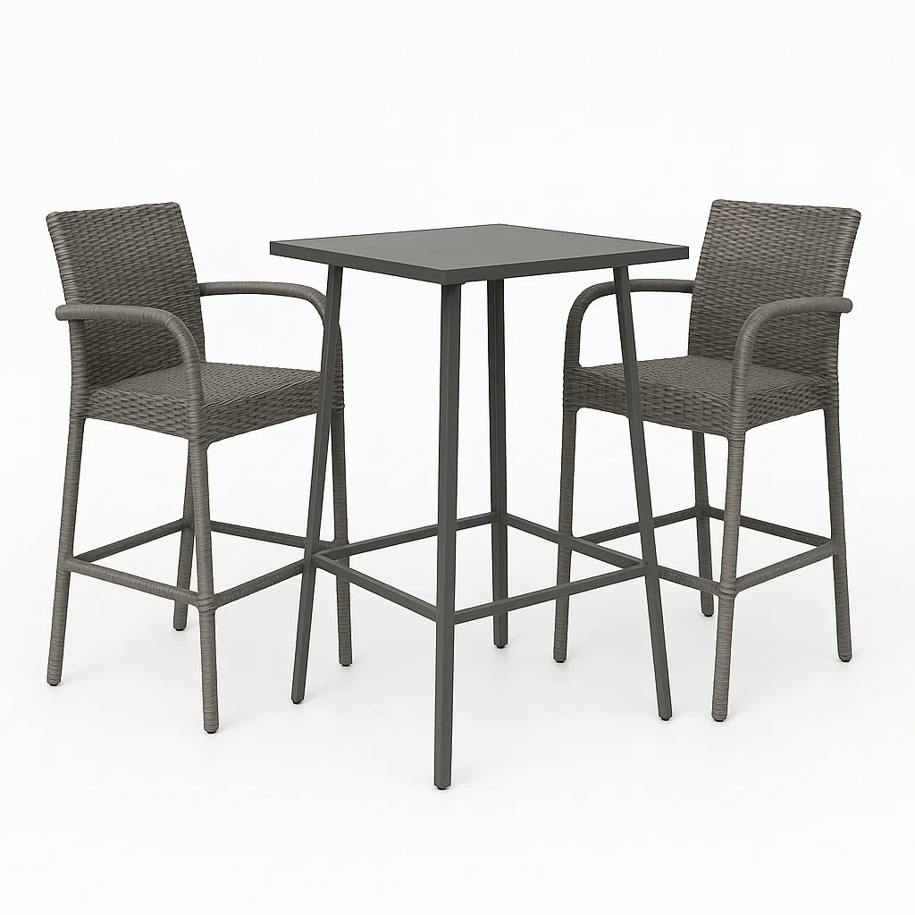 Conjunto de bar de metal y ratán sintético gris con mesa y dos sillas