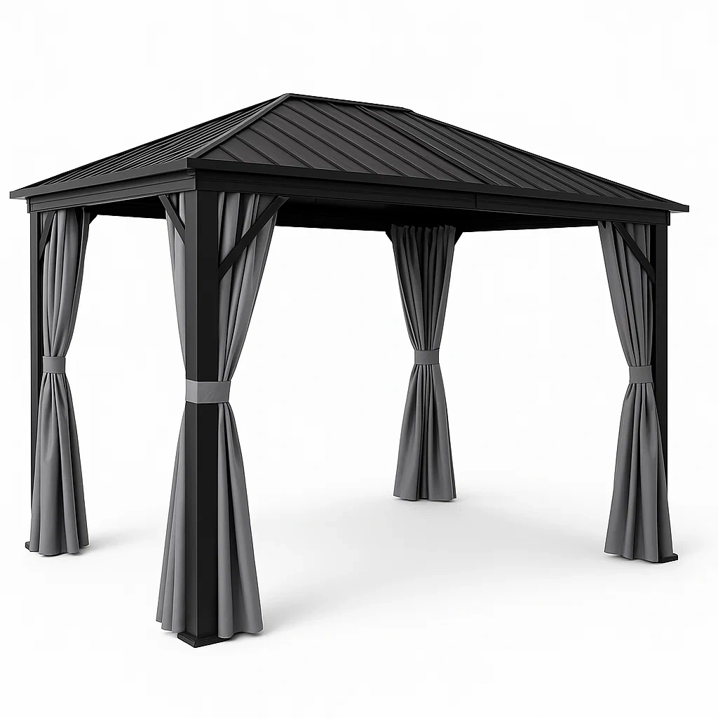 Gazebo de aluminio negro con techo metálico y cortinas de poliéster gris