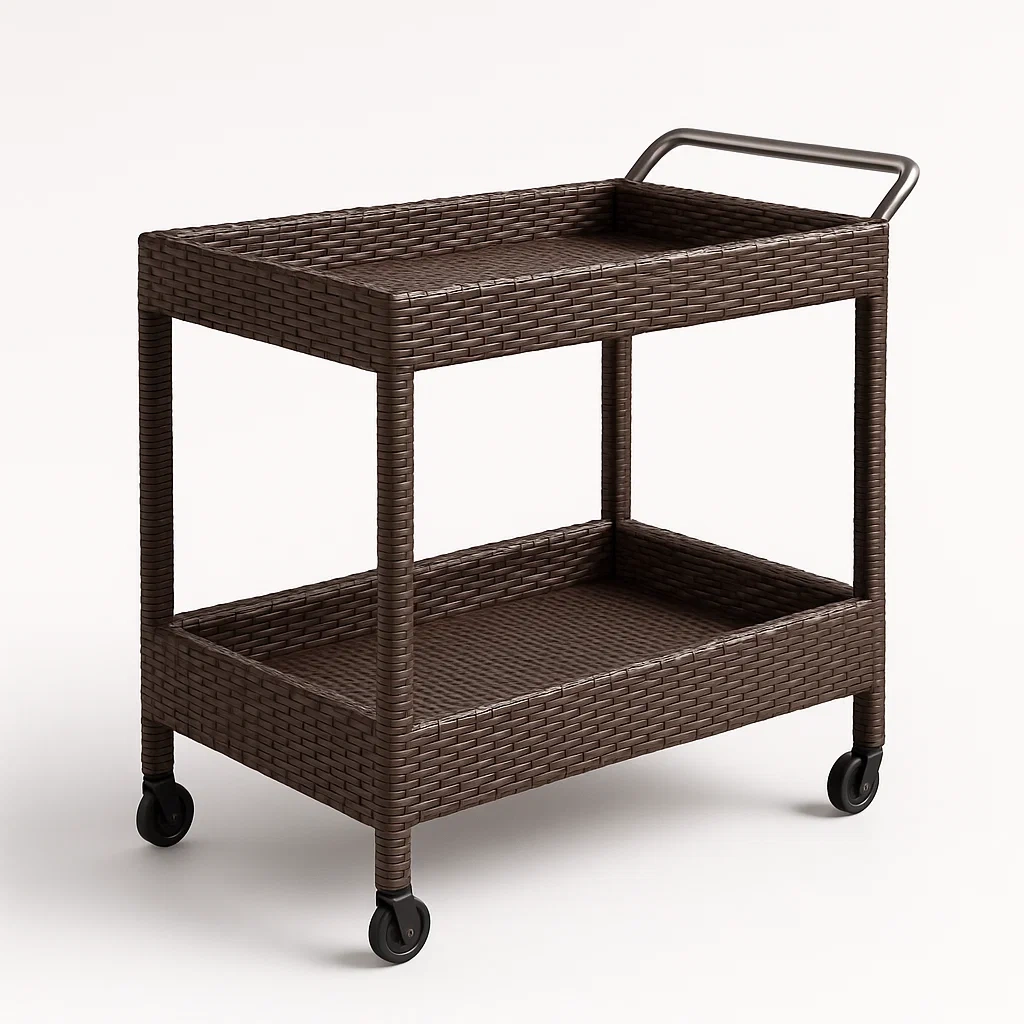 Carrito de ratán marrón con ruedas y estructura de acero inoxidable